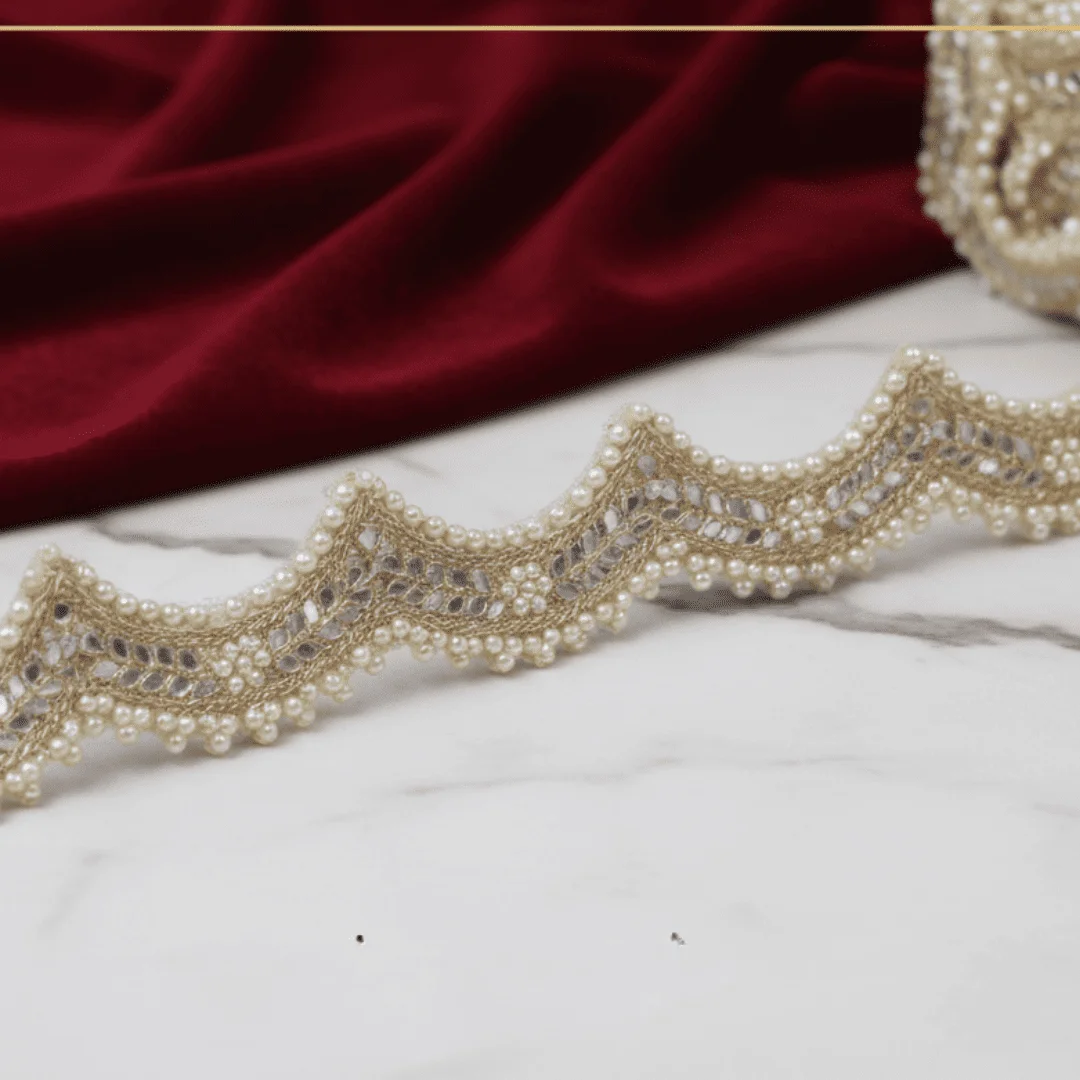 Add a rich and elegant touch to your fashion and décor projects with this beautifully crafted golden curvy net lace. Designed with mirror work, moti accents, and fine embroidery, this lace is perfect for enhancing both ethnic wear and festive decorations.
