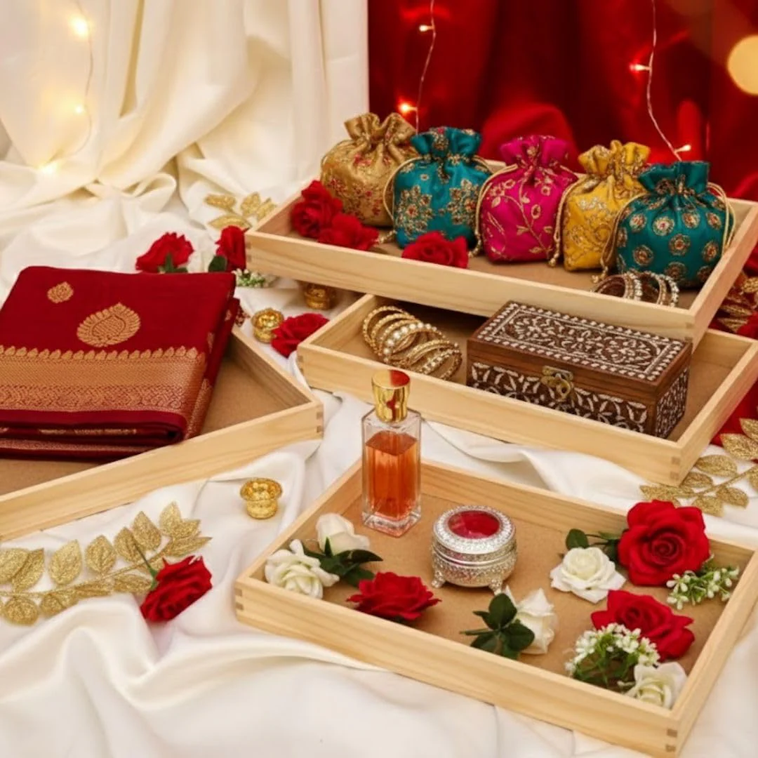 These decorative pinewood trays are perfect for weddings, birthdays, Diwali, festivals, and other special events. They can be used as gift hampers, wedding décor trays, return gift holders, pooja decorative trays, marriage gift boxes, chocolate pack holders, or for storing and presenting various gifts.